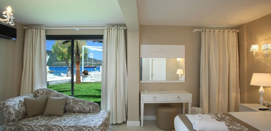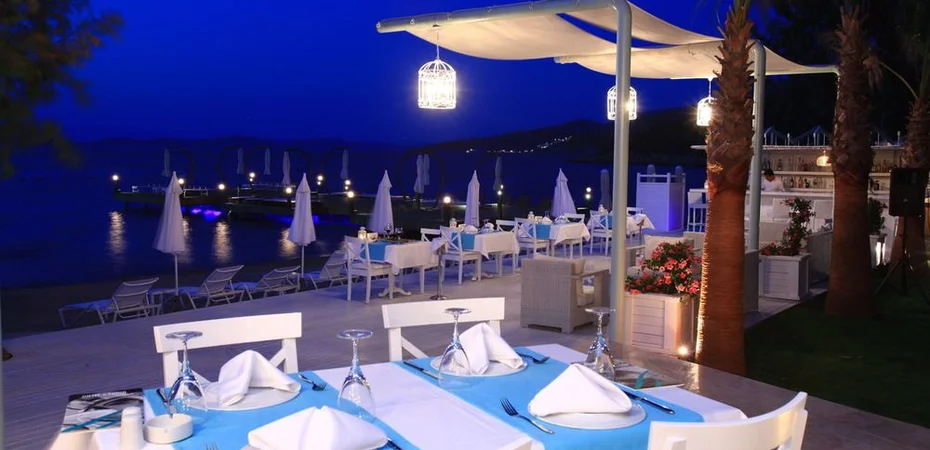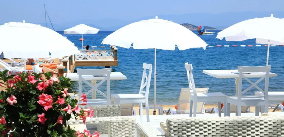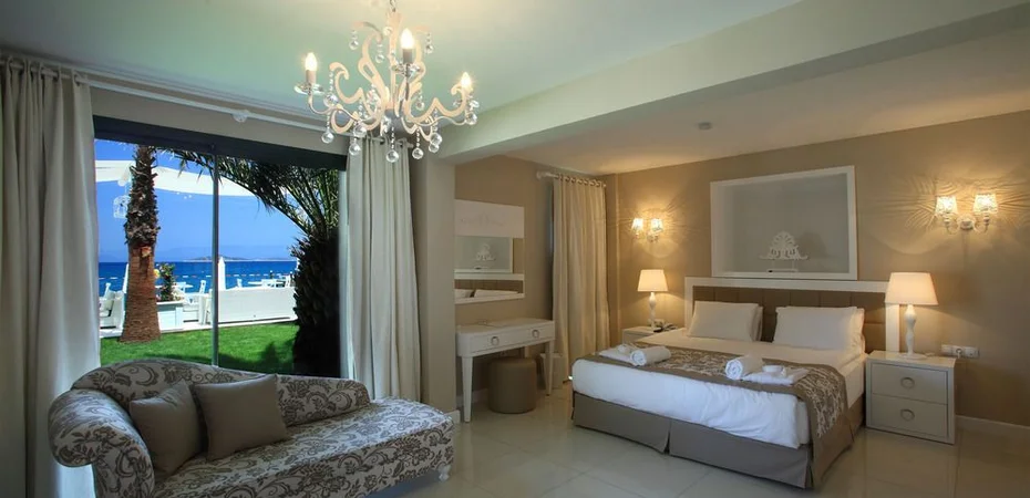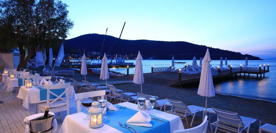 This beachfront hotel in Bodrums-ns Torba region faces the Aegean Sea and has a romantic waterfront terrace and a private beach.