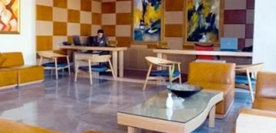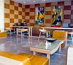 Von mittlerer Grösse mit einem schönen marmorfarbenen un dstylischen Rezeptionstresen und einigen Sesseln die im Raum verteilt sind.