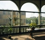 El vestíbulo es grande y tiene el mostrador de recepción al fondo. Está amueblado con estilo moderno pero sencillo.
