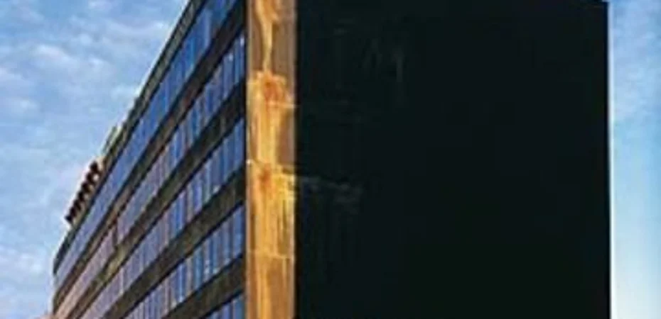 Es un edificio grande, oscuro, similar a un bloque de oficinas.