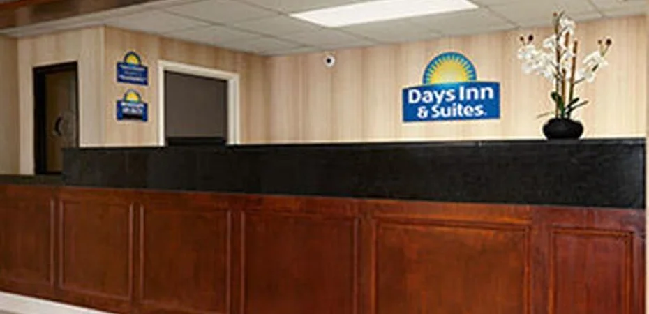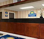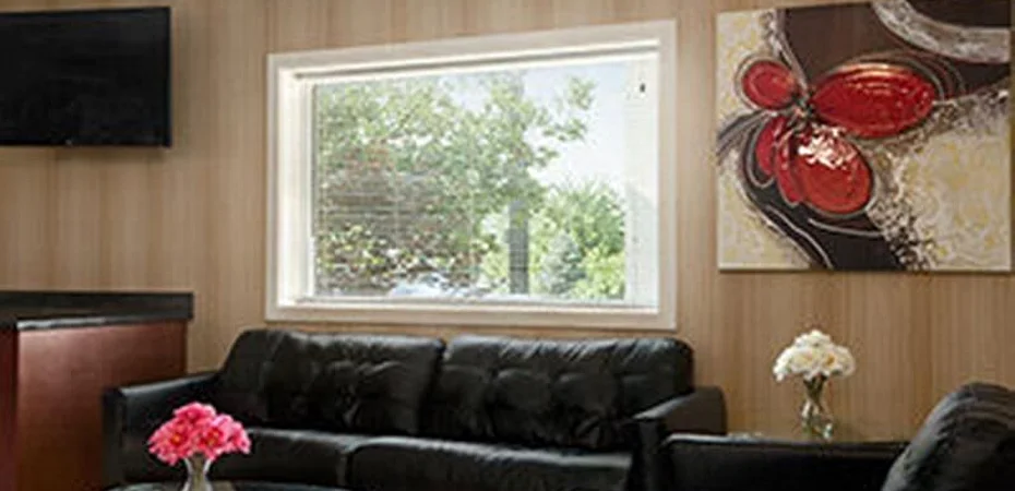 The lobby is small with a comfortable seating area and tiled floors.