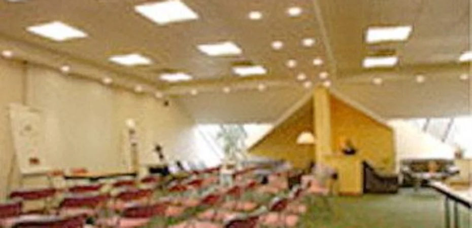 The building is modern and is situated in a verdant area.