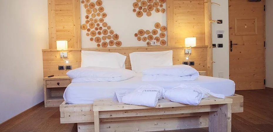 Pineta Hotels consists of three houses and four mountain chalets surrounded by nature. There is room to stay with the family, relax in the HedonÉ Spa. The Pineta is like a small mountain village, immersed in the tranquility of a valley that still keeps its traditions alive.Among the gentle hills of Val di Non, the kingdom of Melinda apples, a small village, all marked by natural well-being, offers a new holiday between large open spaces, large areas dedicated to wellness, bio-architecture rooms and treatments based on apple and elder.Open all year round, it offers you a full programme of indoor and outdoor activities every week.Beauty: an ideal setting for time dedicated to wellness and relaxation. The HedonÉ Wellness Centre is an innovative project, more than 1200 square metres arranged in an amphitheatre, allowing you to move comfortably between large and bright spaces: large indoor swimming pool, whirlpool, large relaxation area, sauna, Turkish steam bath, laconicum, Kneipp path, aromatised showers, cold mist, gym with cardio/fitness equipment and herbal tea.The Beauty area, dedicated to treatments and massages, specializes in a new philosophy of Nature SPA, namely the use of cosmetics made with local products: vegetable butter with extracts of apples from Val di Non, massage creams with elderberry and face masks with berries. An attentive and capable staff will be able to advise you on more than 50 personalized wellness proposals.To keep fit, the Pineta Hotels offers many possibilities for activities in the green and outdoors: hiking or mountain biking ( you can find them here), easy single excursions, pine forest, playground and wide open green spaces.The Chalet del Bosco, this cosy suite in antique larch and fir wood, offers delightful moments in the living room with a country stove. Large terrace with a magnificent view of our valley. Refined bathroom with corner bathtub, large shower and WC area separated by the washbasin area. TV, telephone, safe box, hairdryer and wi-fi internet connection.All with lift and directly connected to the restaurant, bar and wellness center. In winter, snowshoeing, walking, sledging and other snow activities are organised.