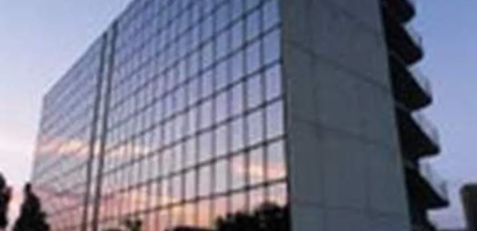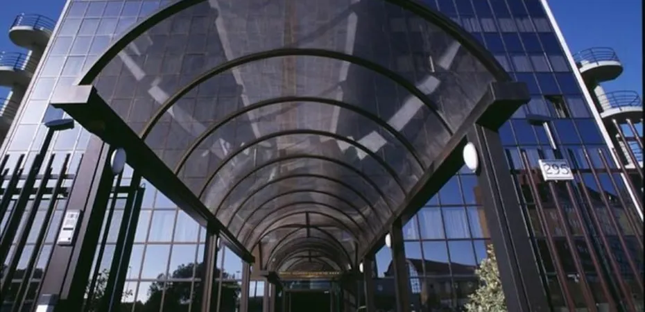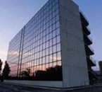 This is a 6-floor modern building, with a mirrored facade.