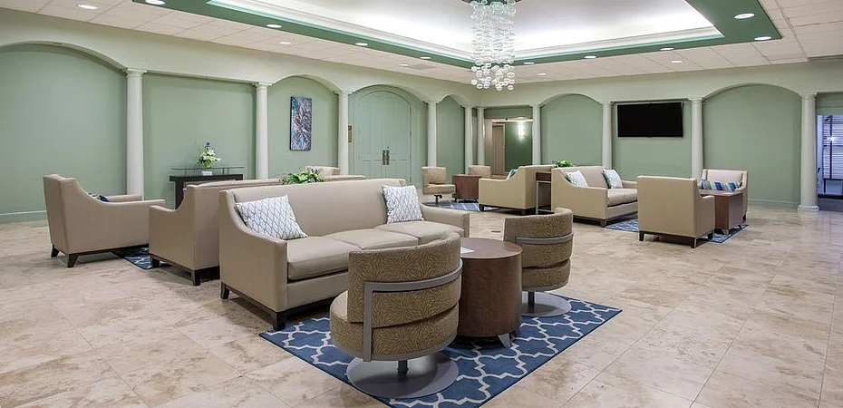 The lobby is medium in size, with brown carpets and sofa chairs. The seating area is in the middle of the lobby and a piano player at the corner of the room.