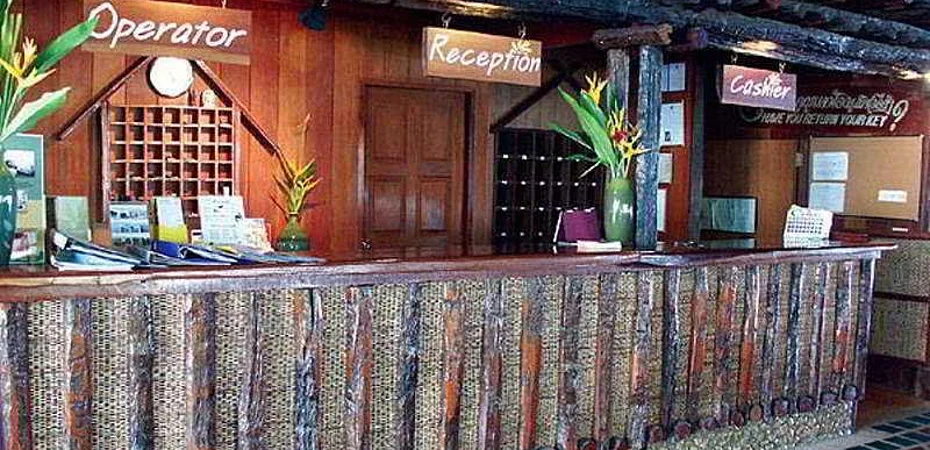 La lobby e la reception costituiscono un ambiente unico, di piccole dimensioni e con limitati posti a sedere; il soffitto e l'arredamento sono in legno